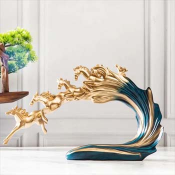 Running Horses Sculpture Showpiece – Golden Horse Figurine with Teal Wave Base